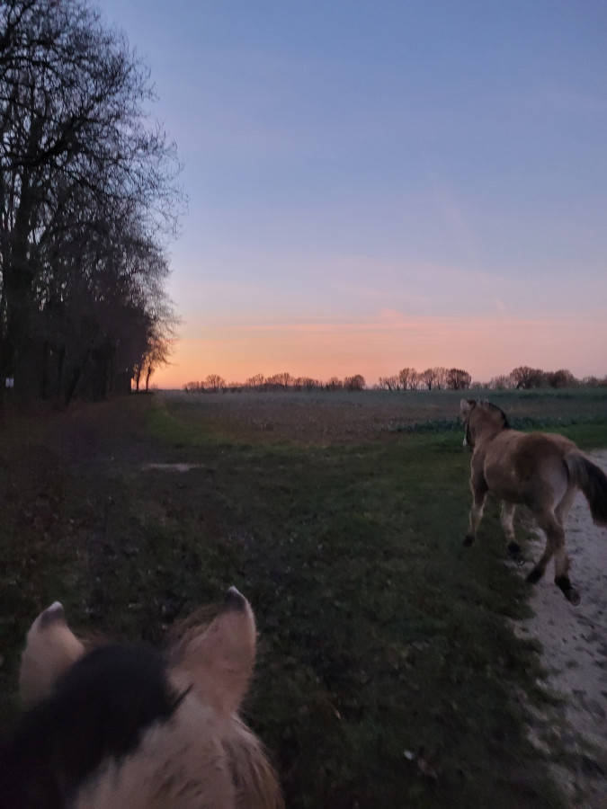 Au départ je voulais faire un peu a pied pour commencer doucement mais Praline ne voulais pas avancer j'ai insisté deux trois fois puis puisque c'est ça je monte, et la ça a été mieux, elle a bien avancé et je suis super fière d'elle car on est rentré a la tombée de la nuit presque au clair de lune et elle a assuré et en remontant le long des prés Prince est venu à notre rencontre et a fait plusieurs départ au galop le long de la clôture et Praline est resté bien aux ordres au pas, juste un petit sursaut pour partir aussi au premier démarrage de Prince mais 3g dans les mains sur le licol et elle est resté au pas, trop fière d'elle !