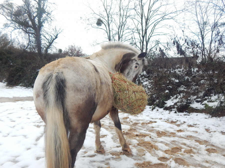 Pendant que Glinski mangeait sa ration, je suis redescendu avec piquets et fils pour clôturer le trou et sécuriser l'endroit. Et puis les deux autres étant resté en bas du pré, je suis monté a cru sur Prince (je savais qu'après être remonté sur "tracteur Glinski" je prenait "ferrari Prince") j'avais envie de remonter sur un cheval un peu plus énergique. J'ai fais un petit tour dans le pré (cheval très a l'écoute et avec un bon pas) pour remonter par un côté en particulier, Pralin-Câline nous a suivi et Prince voulait galoper (il n'as pas forcément de bonnes habitude, mais bon il adore remonter au galop surtout quand la ration l'attend en haut, et j'avais aussi envie de remonter au galop, pour ça que je suis monté sur lui aussi) du coup je lui ai laissé ce petit plaisir et je me suis fais plaisir aussi car il m'a fait un super galop ! J'ai cru qu'on allait s'envoler, c'était génial !! Bon par contre il s'est assez vite arrêté bah oui ça monte mon coco, t'as plus trop d'entrainement et en plus t'es un peu (allez je suis gentille) gros. +400m avec Prince du coup.