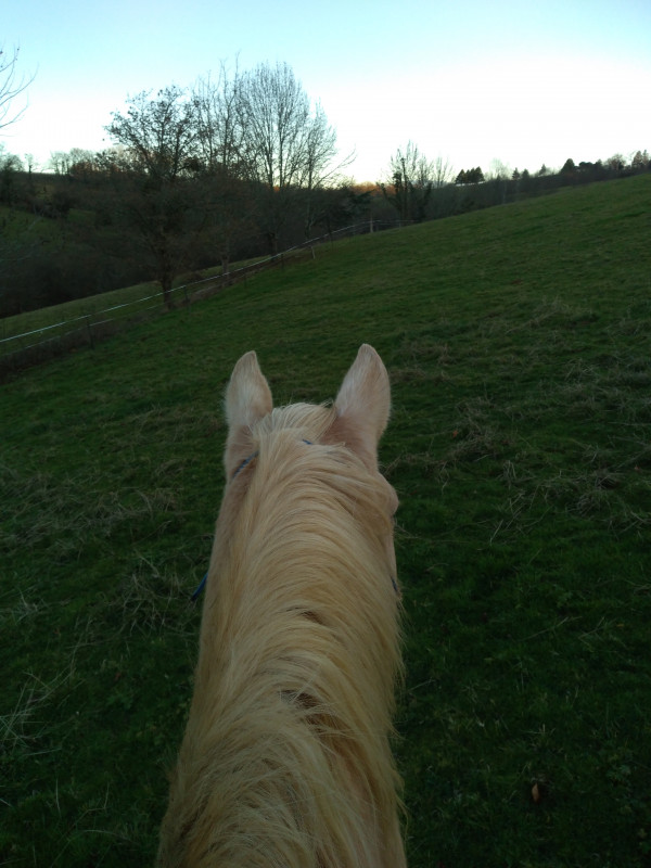 Au début, vu le temps presque printanier je voulais aller faire un tour sur les crêtes avec Glinski, mais en rentrant du travail, le temps de passer un coup de fil a mon assurance pour leur poser une question (les temps d'attente sont un peu long,...), de discuter un peu avec Gilbert en arrivant à l'écurie, ben ça faisait un peu tard surtout que les chevaux étaient au foooond du pré, et avec le couvre-feu...