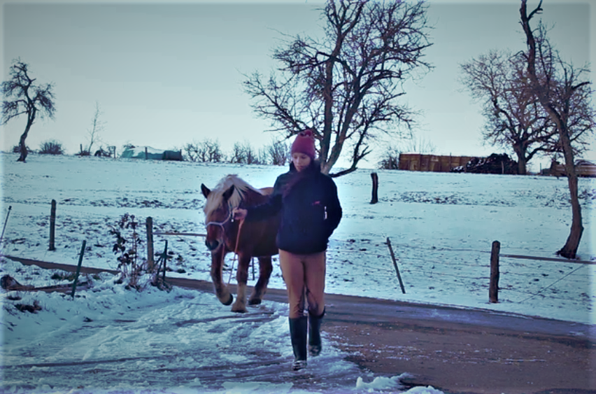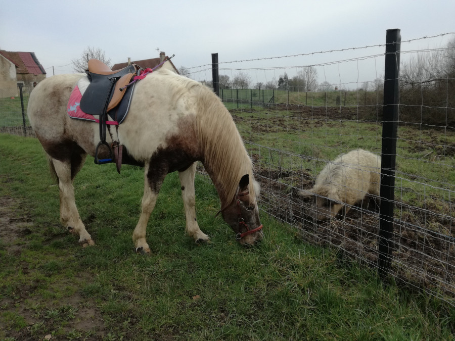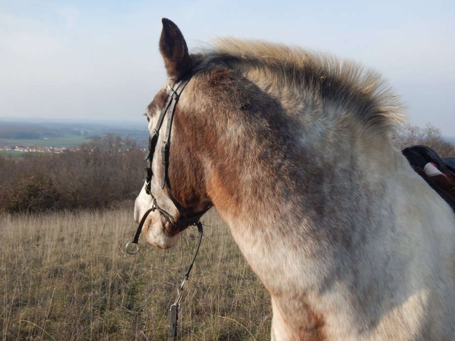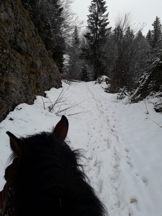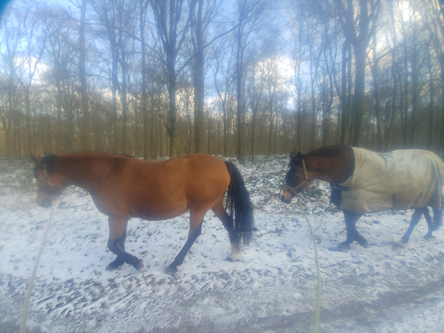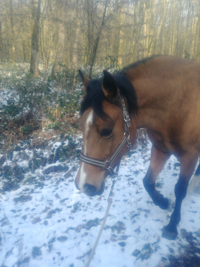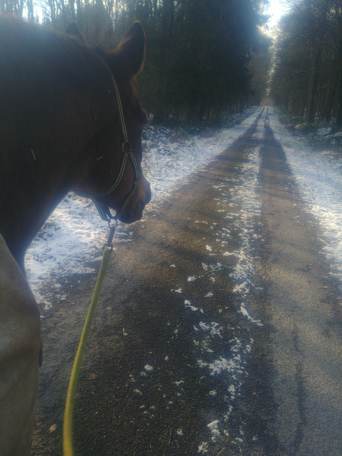 Balade avec ma fille cet après-midi, je me suis dit qu'on allait essayer d'aller un peu plus loin, en restant près des champs pour éviter la neige dans les bois, ba c'est raté. Par moment, ils enfonçaient même bien, c'est notre chemin de galop, du coup on a marché, à peine trotté. Une fois le long de la route, je propose un trot le long du champ, ma louloute c'est fait peur, apparemment la ponette lui aurait mis 2 coups de dos avant de partir au galop ( doucement, en monté, faut pas pousser). Rebelotte au pas alors qu'on aurait pu galoper sur cette portion.