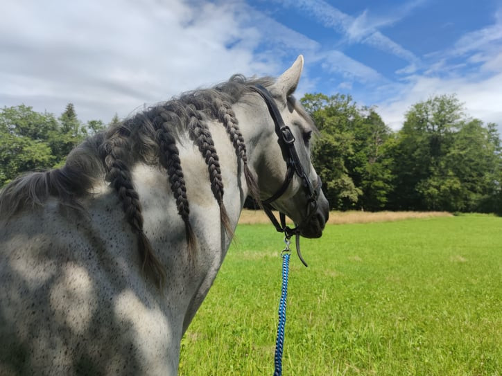 Nous c'était une séance courte en LR dans les environs de l'écurie. Il faisait très chaud aujourd'hui mais c'est pas grave, poney était content même si les mouches l'ont agacés plus d'une fois. Le pauvre voulait bien trotter mais il s'arrêtait souvent pour se mordre la croupe... J'ai voulu en chasser une avec le stick mais j'ai tapé un peu fort, il a fait un bon sous la surprise le pauvre