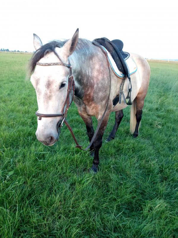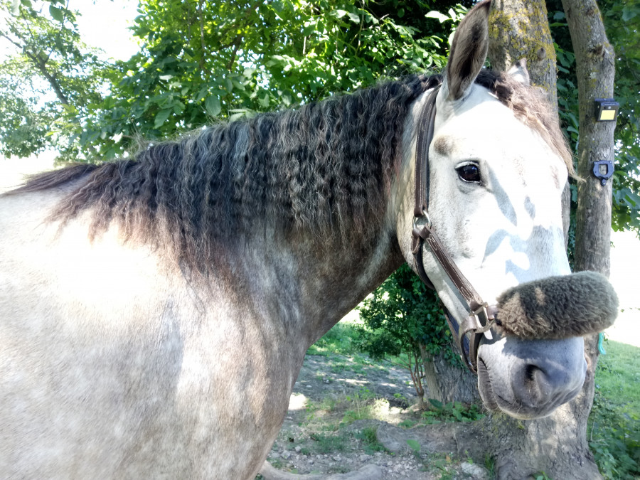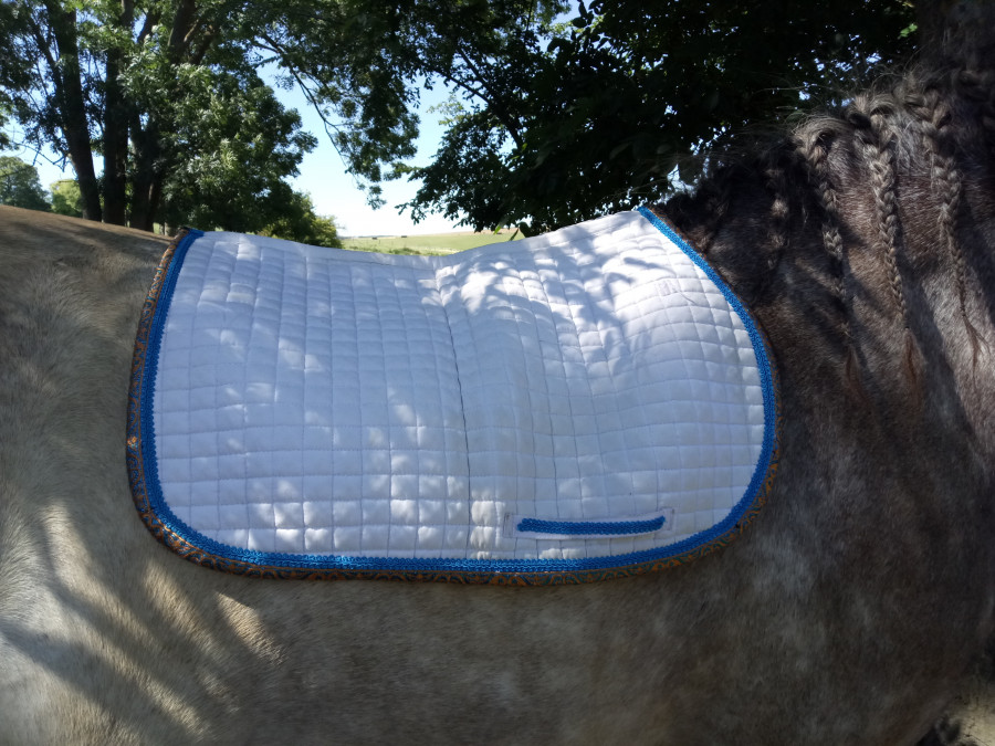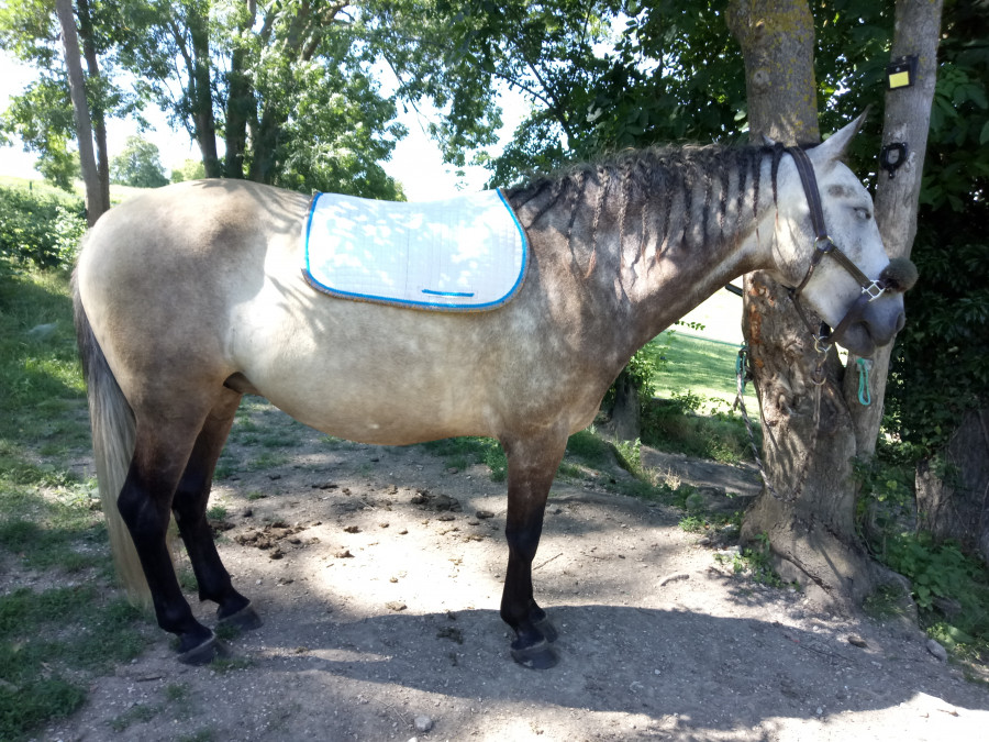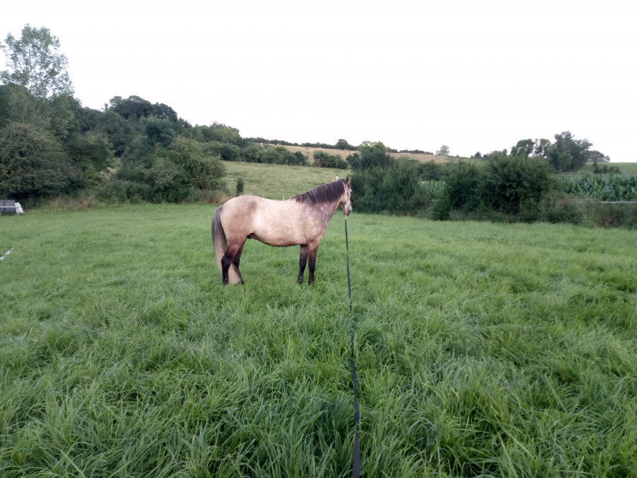 Hier à cause du tour de France j étais bloquée toute l aprem donc on a pas fait grand chose. D abord gros pansage, j ai défait ces tresses, graisser les pieds, mis de l anti mouche en prenant tout mon temps. Ensuite, on a fait les étirements des antérieurs et postérieurs puis les flexions latérales de la nuque. D ailleurs c'est marrant parce qu'en licol il le fait avec 0 résistance alors qu avec le filet il résiste avant de céder. Je lui ai essayé son nouveau tapis, enfaîte c'est une ancien que j avais blanc avec des tâches sur lequel j ai mis un ruban et un biais