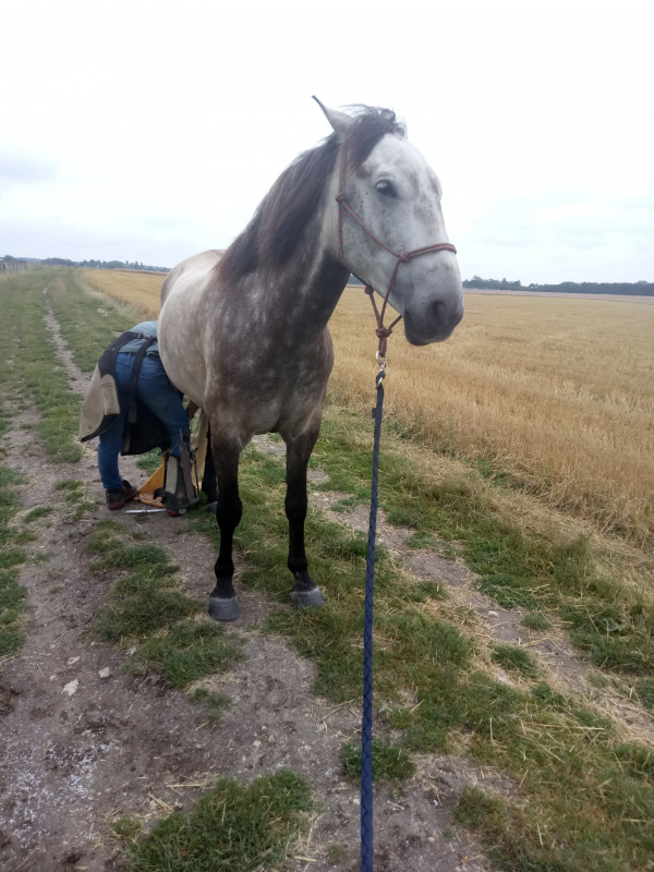 Ensuite, j'ai longé avec beaucoup de transitions et assez rapproché. Ensuite le galop, on a fait pas mal de départ pour qu'il ne s'effondre pas, j'ai trouvé qu'il galopait moins vite que d'habitude (meilleur équilibre?). Par contre après le galop, on a perdu l'arrêt du coup on a repris des transitions pas-arrêt pour le reconnecter. On a fini par des départs au galop du pas, je dois encore raccourcir le cercle pour éviter qu'il passe par le trot si je suis trop loin, à main droite, il m'en a fait des très jolis où il poussait bien. On fini avec un peu de trot en extension puis la pareuse est arrivée. Il a eu le droit de rester en liberté dehors à brouter pendant que je présentais un autre cheval. Puis à lui, il a été très sage avec la pareuse