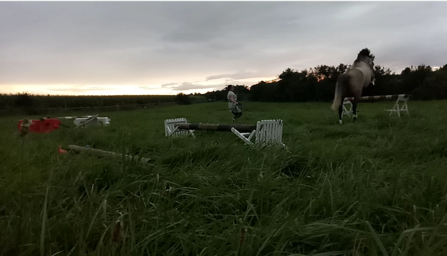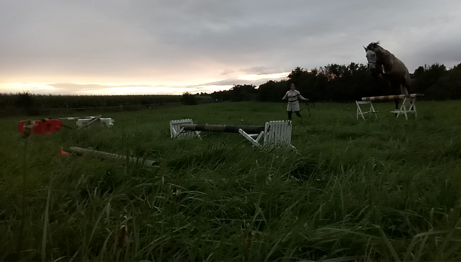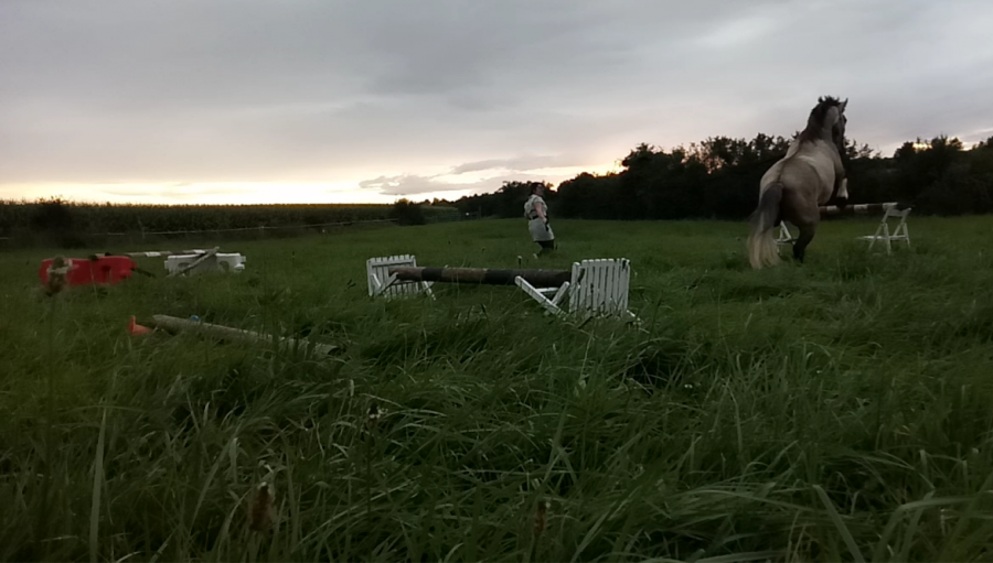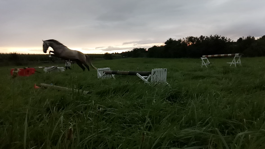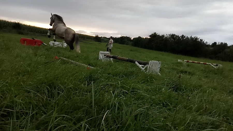 Ce soir, j étais partie sur une séance de saut en liberté mais trop d herbe donc galère à tout installer. A la place on a sauté en longe. Dans un sens j avais mis un mini saut de puce quelques foulées et 1 verticale et dans l autre j avais mis au départ 1 croix puis un oxer. J ai monté les barres au fur et à mesure de la séance et on a fini sur un vertical assez large. Par contre sur le vertical il a fait quelques refus