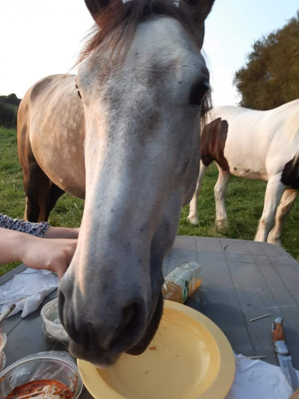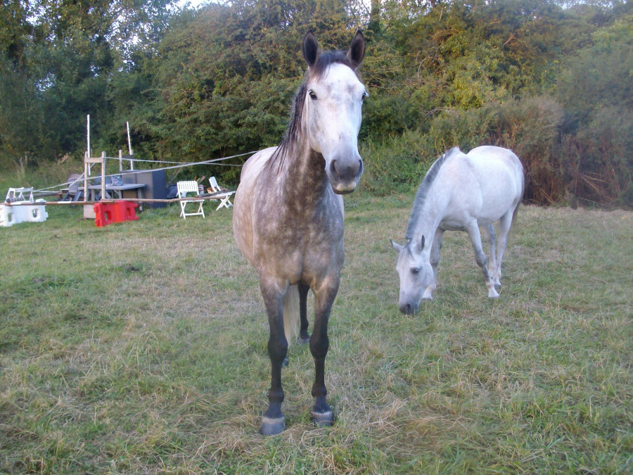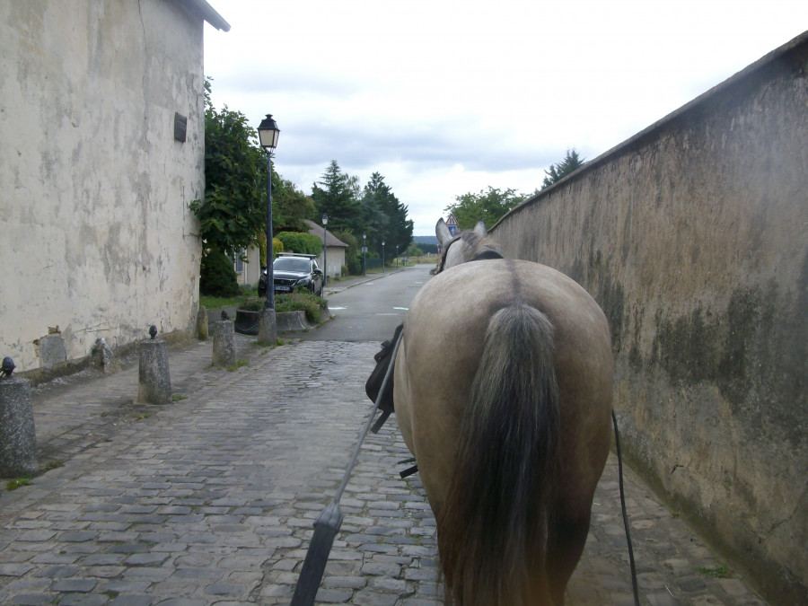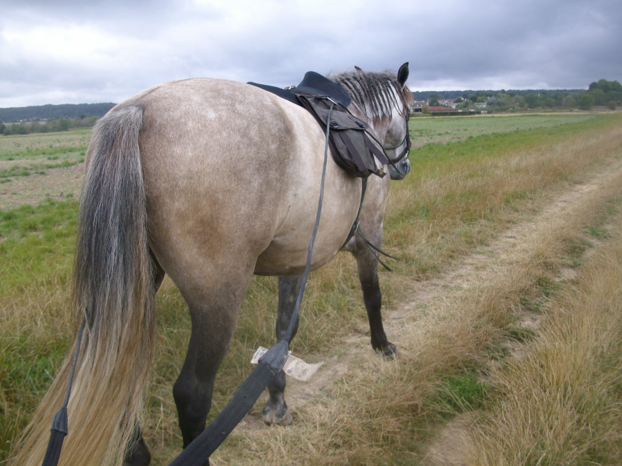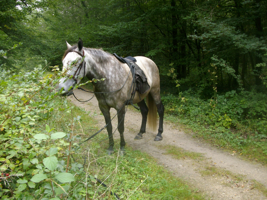 Aujourd'hui, on est parti en longues rênes chercher des mûres en forêt pour faire un gâteau, je lui ai mis les sacoches pour qu'il porte les boîtes et à boire. Je le laissé presque libre pendant que je ramassais, où il ne bougeait pas ou il brouter un peu. Pour le retour, on est passé en pleine ville, les gens adorent et s'arrêtent pour regarder. Cet après midi on avait une intégration au pré qui c'est bien passé