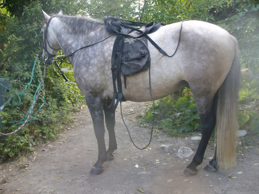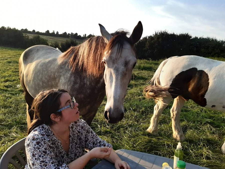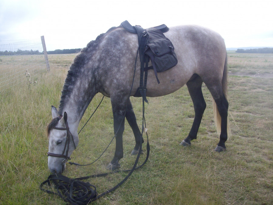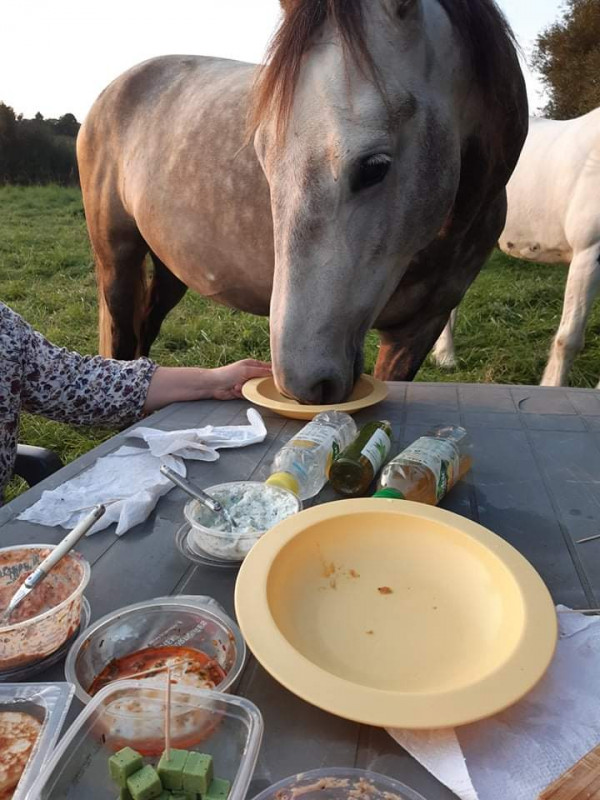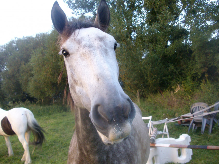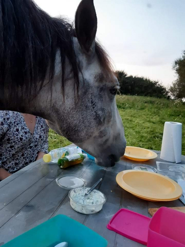 Aujourd'hui, on est parti en longues rênes chercher des mûres en forêt pour faire un gâteau, je lui ai mis les sacoches pour qu'il porte les boîtes et à boire. Je le laissé presque libre pendant que je ramassais, où il ne bougeait pas ou il brouter un peu. Pour le retour, on est passé en pleine ville, les gens adorent et s'arrêtent pour regarder. Cet après midi on avait une intégration au pré qui c'est bien passé