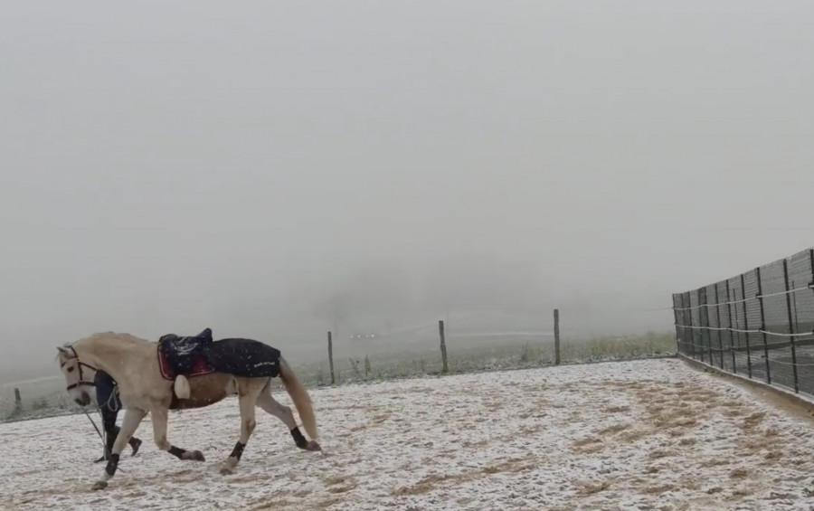 Ce matin, cours avec ma prof, j'étais pas du tout motivé... Il faisait froid, il neigeait et il y avait un vent de dingue... Je récupère Esperado trempé (il n'est pas couvert), j'ai mis chauffe dos bot et séchante mais le résultat était pas top quand même... J'ai échauffé avec un peu de travail à l'épaule en attendant la prof. On a aleterné des courbes, des épaules en dedans, des hanches en dehors, déplacements latéraux, sortir les hanches sur un cercle et des demi tours sur les hanches en poussant les épaules. Il m'a tout bien fait et dans le calme