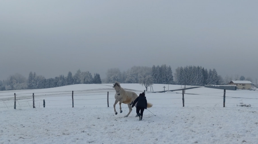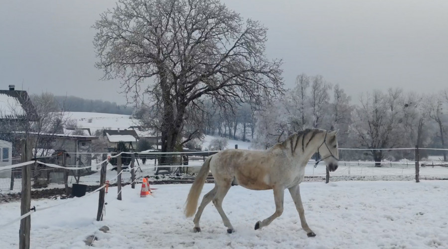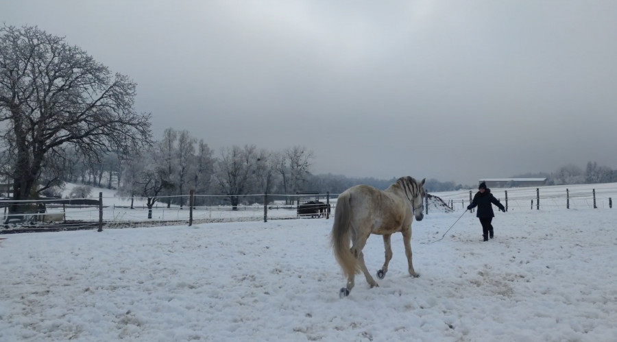 Hier soir, je suis passée longer Esperado sous -3°C et l'herbe gelée. On a fait simple. On a commencé par au pas des spirales avec descente d'encolure si il voulait, changement de main puis des arrêts. Il descendait bien au pas en extension.