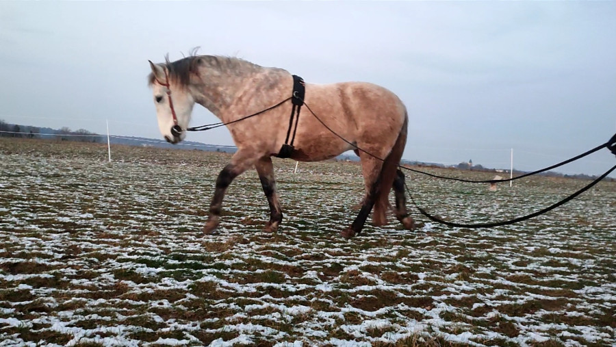 On est partis 45 minutes, 2km et on a bossé un peu type TAP dehors ! Pas mal de transitions pas-arrêt voire reculer, quelques départs au trot, à part à un moment où il était en mode neuneu à cause du vent il a été top ! Et on a même repris le reculer par aspiration qu'il m'a donné 2-3 fois à la fin top sans que je touche la longe