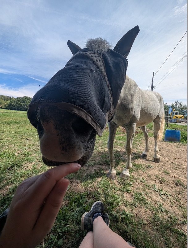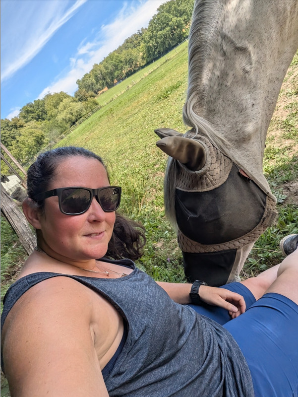 Après ça je suis restée une vingtaine de minutes assise dans le pré, il venait me faire des câlins et dans tous les cas restait brouter pas loin de moi