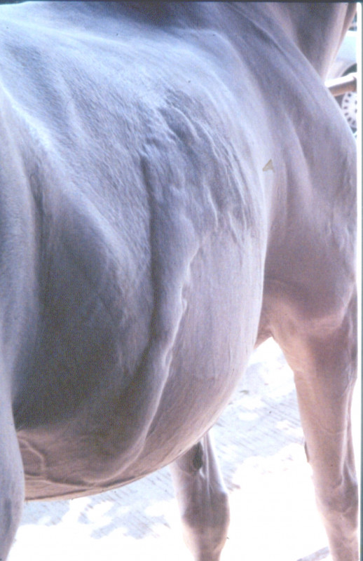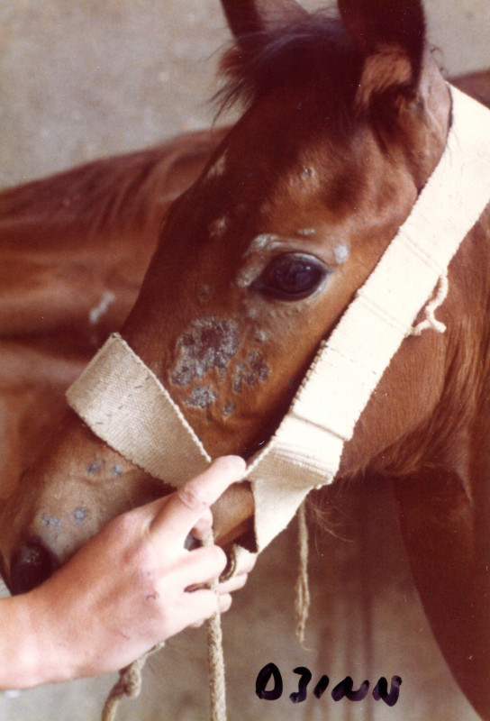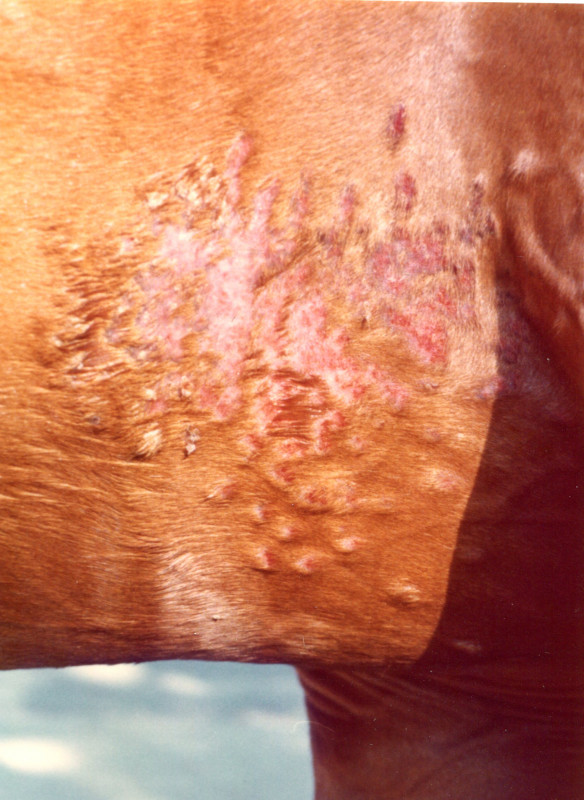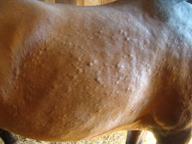 Premiers signes : poils se redressant et formant des cercles de 5 – 15mm. Puis les poils tombent, la peau apparaît grisâtre. Il est fréquent qu’ils laissent des taches blanches sur les robes alezanes ou noires sur les bais ou gris. De par mes observations ces taches vont s’atténuer avec les années.