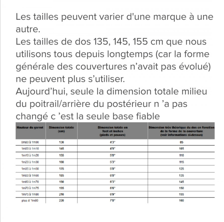 Quand à tes chevaux, il faut mesurer la longueur de dos, et te référer au guide des tailles,