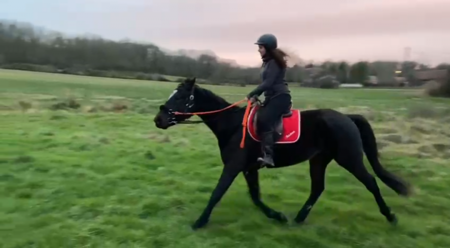 On trotte, je suis à la boucle des rênes du sidepull, il écoute, ralenti quand je dis "douuuuceeeemeeeent", garde la cadence réduite puis reprends quand je lui dit que c'est bon, je suis ravie !