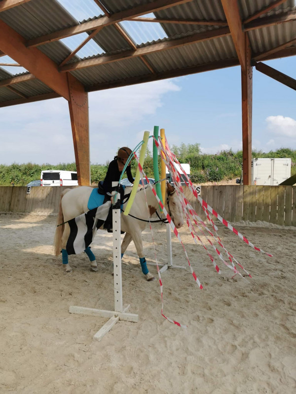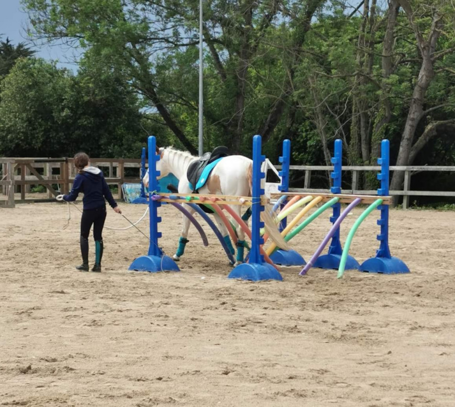 On a passé plein d'obstacles divers le tout en réalisant du travail de dressage. C'était très varié autant pour le cheval que pour le cavalier donc très formateur. Obstacle, slalom, passage de frites, passage sur divers matériaux, porté de saut, de drapeaux, demi tour sur postérieurs antérieurs, reculé, déplacements latéraux sur barres au sol....on a tout fait!!!!
