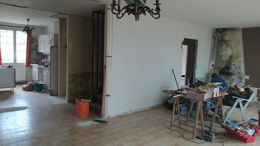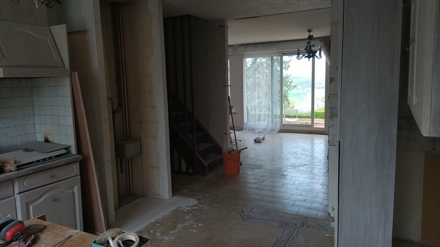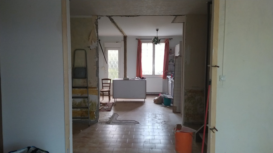 - vue depuis le salon sur la cuisine qui rend déjà beaucoup plus lumineuse (je rigolais sur les portes, on se retrouve avec la 2e porte vachement visible, on va la condamner mais je me tâte à garder une fenêtre à son emplacement quand même vu que ça donne pleins nord),