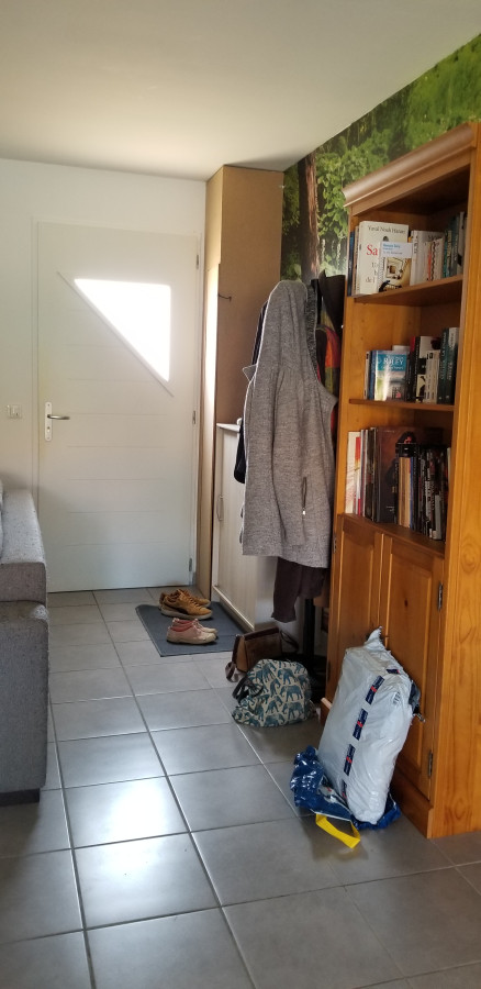 Mon entrée est ouverte sur mon séjour, le canapé gris est sur la gauche de la photo. La porte d'entrée est en fond. L'espèce de tour c'est l'ancien proprio qui a fait ça, dedans il y a le tableau électrique, le compteur linky et notre box internet. Ensuite un meuble a chaussures, un porte manteau (on aimerait l'enlever et mettre plutôt des patères au mur), et une bibliothèque.