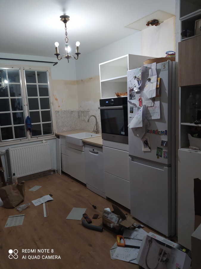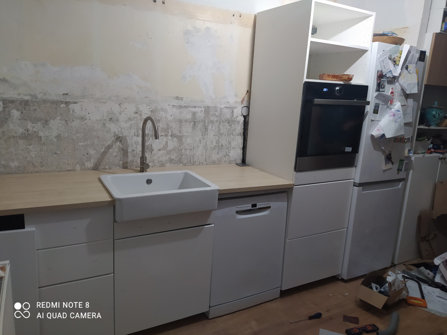La plomberie n'est pas totalement finie, il y a de la colle qui sèche et on n'a pas mis encore les joint. J'ai eu un petit souci avec la porte du placard contre la fenêtre, on doit couper un bout du rebord en bois pour qu'elle puisse passer.