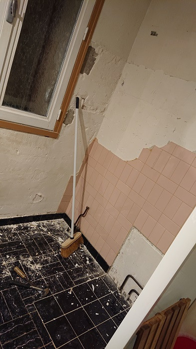 - quand on a retiré la cabine de douche, on s'est rendu compte qu'elle cachait une une fenêtre fixe en hauteur vers les wc ? dans les wc, elle était cachée par un meuble ... du coup, on est bons à refaire les wc aussi maintenant vu qu'on a dû casser et reboucher.