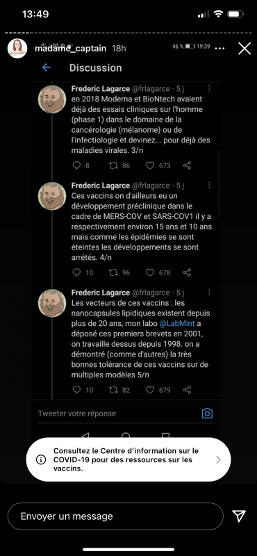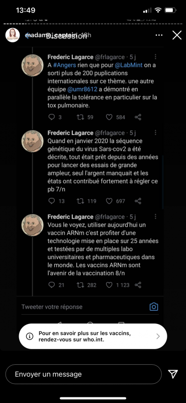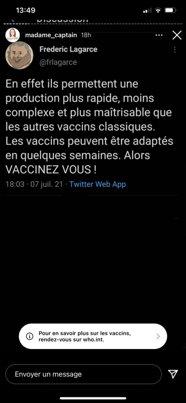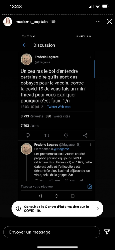 Moi ce que je ne comprend pas dans la réticence au vaccin c'est que même si, imaginons, le vaccin a des conséquences sur notre organisme et on le découvre dans 10 ans, ça peut aussi être le cas d'autres traitement qu'un médecin nous prescrit et là les gens vont pas réfléchir à ces conséquences.