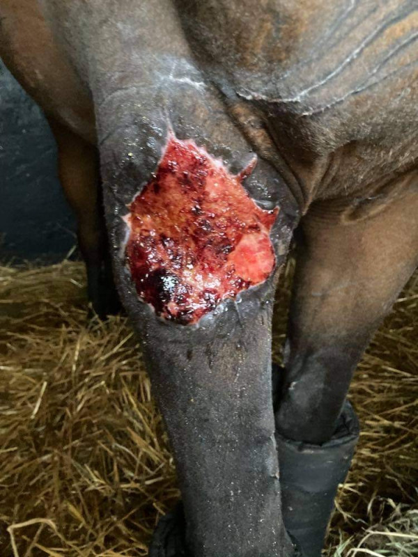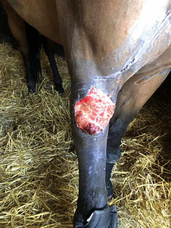 Mais le Lundi 12 juillet, c'est le drame, elle s' échappe de son pré et se blesse au niveau de l'avant-bras de son antérieur droit avec des barbelés. Je précise que les barbelés n'étaient pas au niveau de son pré mais dans un champ voisin pour accueillir des vaches. Je ne sais pas exactement ce qu'il s'est passé, je n'était pas sur place quand ça s'est produit et la jument a été retrouvée très loin de son pré et des écuries.