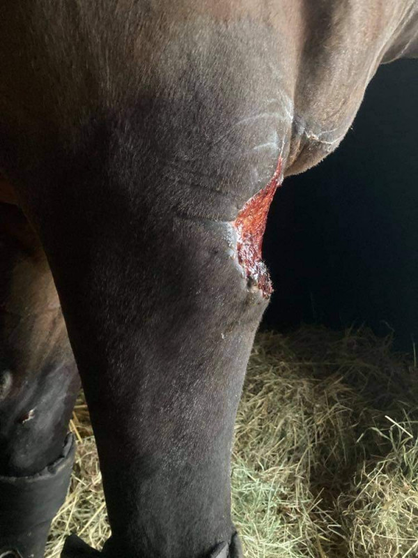 Mais le Lundi 12 juillet, c'est le drame, elle s' échappe de son pré et se blesse au niveau de l'avant-bras de son antérieur droit avec des barbelés. Je précise que les barbelés n'étaient pas au niveau de son pré mais dans un champ voisin pour accueillir des vaches. Je ne sais pas exactement ce qu'il s'est passé, je n'était pas sur place quand ça s'est produit et la jument a été retrouvée très loin de son pré et des écuries.