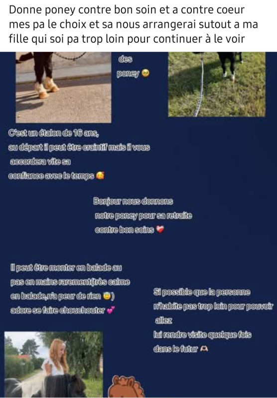 cataclope il y en a tellement des comme ça ! Quand je cherchais ma relève il y a 6 ans, j'étais tombée sur un cheval soit-disant à vendre qui me plaisait bien mais quand tu lisais l'annonce, il ne fallait pas le déménager ou alors pas au-delà d'une certaine distance, il fallait que la vendeuse puisse venir le voir et bien entendu continuer de le monter...