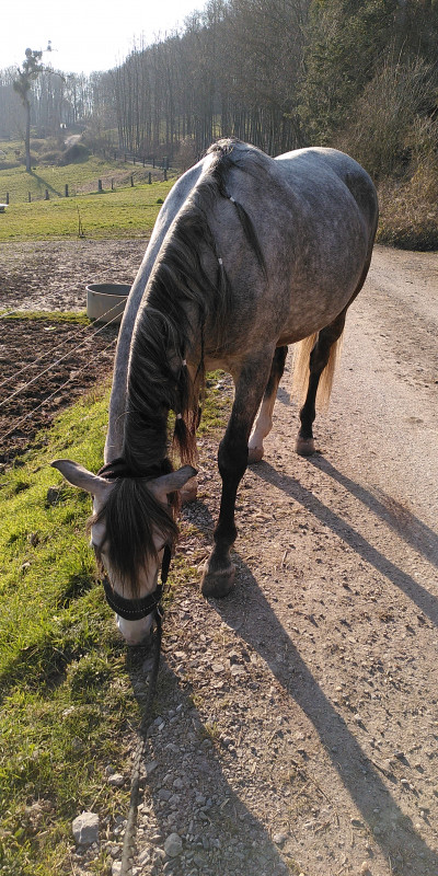 Je suis donc depuis un peu plus de 3 mois propriétaire de Pastor de Vara, hongre Pure Race Espagnole de 6 ans, né en Espagne et importé en Belgique en 2020. Avec sa gigantesque crinière et son regard enchanteur, j'ai pensé pendant des mois que c'était un cheval à problème ou avec un vice caché qui attendait d'être refourgué à une gamine... Ma mère continue de dire que c'était le destin, et qu'il fallait juste qu'on se rencontre. Je suis absolument raide dingue de ce cheval, outre le trouver superbe, il s'est révélé avoir une personnalité et un mental en or brut.