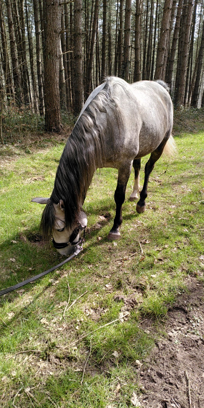 Chouettes sensations, poney rangé après 45mn parce qu'il était top. Sortie en forêt malgré le vent pour retourner à l'herbe et préparer un peu l'estomac pour dans deux semaines