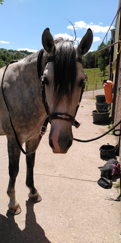 Côté cuir, ça a l'air bien ! Je l'ai pas encore trituré mais aucun soucis pour ajuster sur la tête (par comparaison, mon filet Dy'on neuf ça a été une misère pour régler les montants). Il est assez épais et plutôt lourd, par rapport à mon filet dont j'ai gardé que les montants principaux, ça ça fait bizarre. À voir comment il se donne, mais je dirais vraiment pas qu'il est raide !