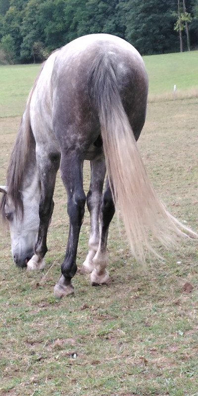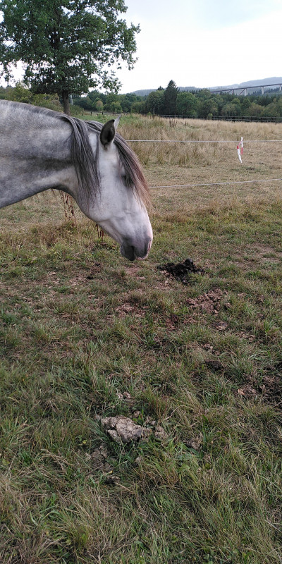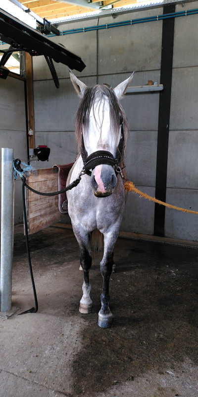 Bon les premiers jours je ne l'ai même pas sorti du pré, histoire que ça ne soit pas la cavalcade au retour. Il s'est beaucoup fait courser par le dominant (et moi avec, ça j'apprécie moyen), il a pas mal de petites blessures mais rien de grave. Après quelques jours j'ai commencé à le sortir juste pour lui donner sa ration en dehors du pré et dimanche on est enfin remontée à l'écurie pour la première fois !