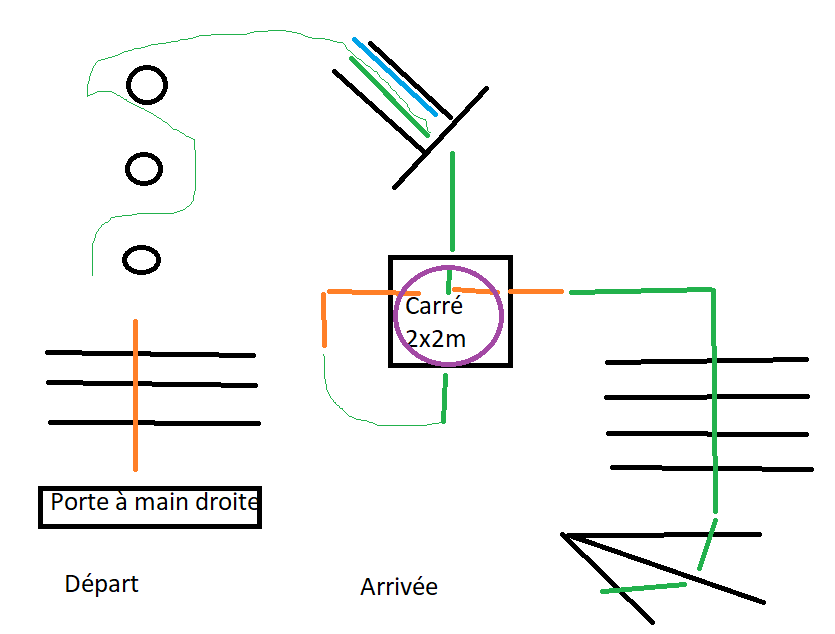 Donc ouverture de porte à main droite, 3 barres au sol au pas, slalom au trot, tournant en épingle pour rentrer dans un couloir au trot, arrêt devant la barre de fin du couloir. Reculer jusqu'à ressortir du couloir, départ au trot pour retraverser le couloir, traverser le carré et entamer une demi-volte, passage au pas pour rentrer dans le carré. Arrêt dans le carré et 360 degrés sur les épaules sans toucher les barres ni sortir un pied, sortir du carré au pas. Prendre le trot pour descendre sur 4 barres au sol, 3 barres au sol en angle, et arrêt final.