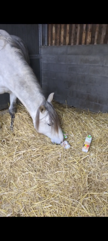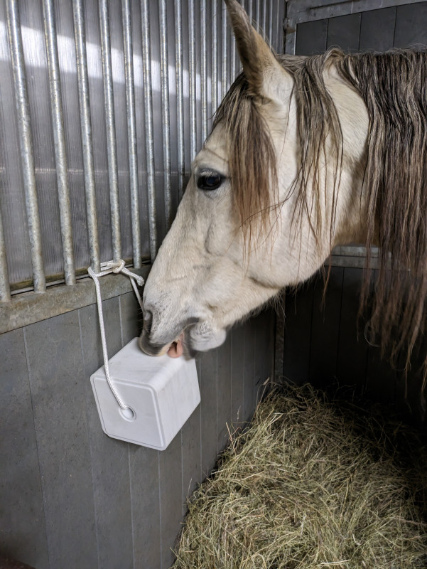 - stress dass le van : je vais pas aller dans les détails parce que j'ai pas demandé à la propriétaire si je pouvais raconter son cas. En gros il s'agissait d'un cheval qui monte très bien, mais paniquait après un certain temps de trajet, au point de devoir aller à la sédation pour rouler en sécurité. On a démêlé beaucoup de choses pour essayer d'identifier au mieux les déclencheurs, et on a travaillé sur les pistes liées à la douleur, anxiété de séparation et proprioception (notamment mat training). L'utilisation d'enrichissements a eu un très très bon effet ici sur les niveaux de stress en général.