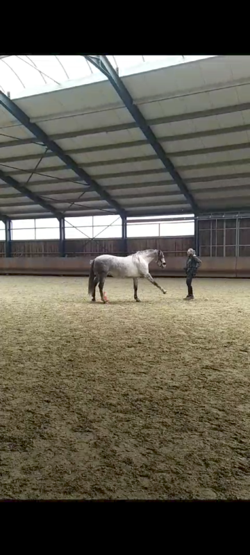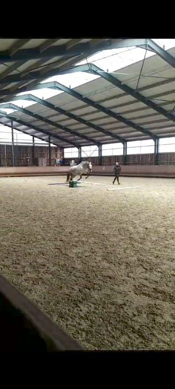 Hier je l'ai monté, déjà 24h après le retour au box on voit qu'il est pas très content. À mon avis il a dû manquer de foin à un moment. Néanmoins il a été brave malgré les conditions météo pas évidentes qui faisaient du bruit et un peu de ramdam dans l'écurie adjacente. Il était tendu mais revenait au calme entre chaque petit stress. J'avais mis des barres au sol aux points cardinaux d'un grand cercle pour l'aider à canaliser son attention. Ça s'est bien passé !