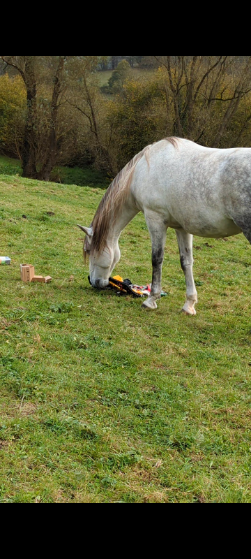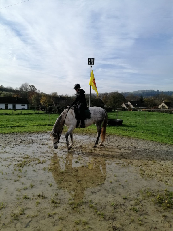 Ici, ils sont toujours dehors H24 en ce moment et on l'a souvent vu jouer avec l'autre hongre. Ils font les malins, se grimpent un peu dessus et se font des galops pleine balle le long du pré. Ça lui pose beaucoup la tête. Je vois la différence entre quand il est dans un pré plat ou dans ceux plus vallonnés où ça glisse. Dans le deuxième cas, après une semaine il piaffe à l'entrée de la carrière et fait des figures artistiques dès qu'il est dans le sable.