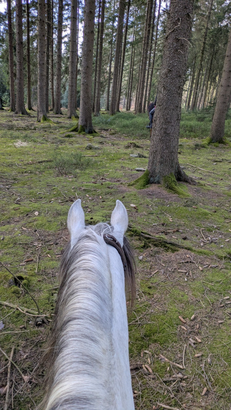 Samedi dernier on a donc fait la première de l'année en selle, la précédente datant d'octobre dernier et celle encore avant de -1200 avant JC lol. J'avoue j'étais un peu tendue. Pastor aussi. L'hiver à bouger au pré ça lui a déjà fait développer un peu plus de condition et il était PATATE. On monte dans les bois, il passe son temps à essayer de croquer le copain qui était devant. On s'était dit que ça serait mieux pour guider Pastor.