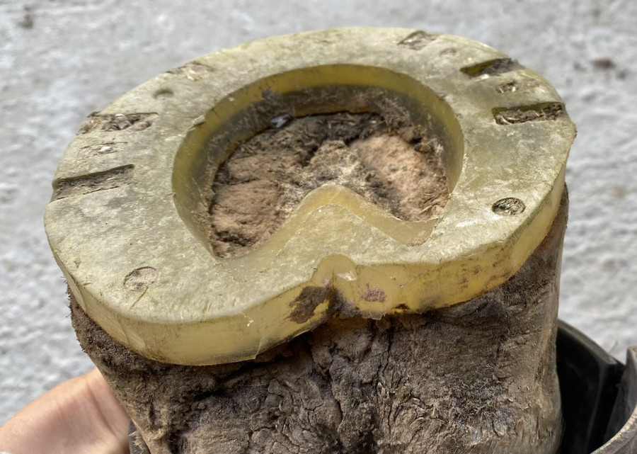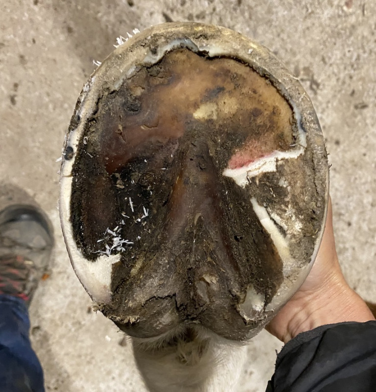 Son abcès de septembre (qui avait percé en couronne et en gnome) a pris TOUTE la sole, il a donc fabriqué une nouvelle sole et perdu l'ancienne.