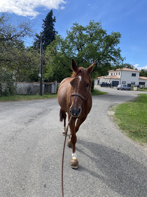 - 4 jours de balade en main en augmentant de 15min à 1h (même si on est sur un cheval qui vit au pré et qui marche, il marche de façon fort peu tonique)