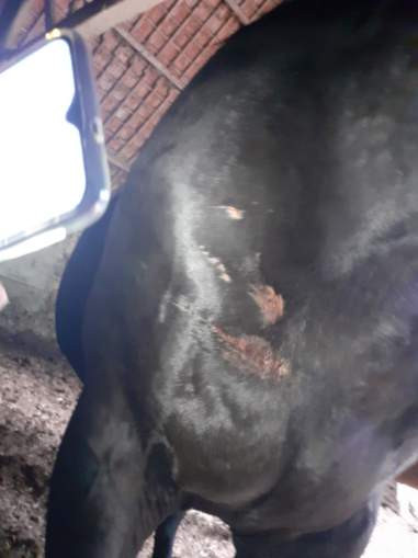 ensuite au pas tranquille , mais je suis resté dessus et la 3eme fois idem au pas il part sur les genoux, galère à se relevé... je descend , fer tordu et qui tiens plus que par 2 clous donc je retire et on rentre à la maison..