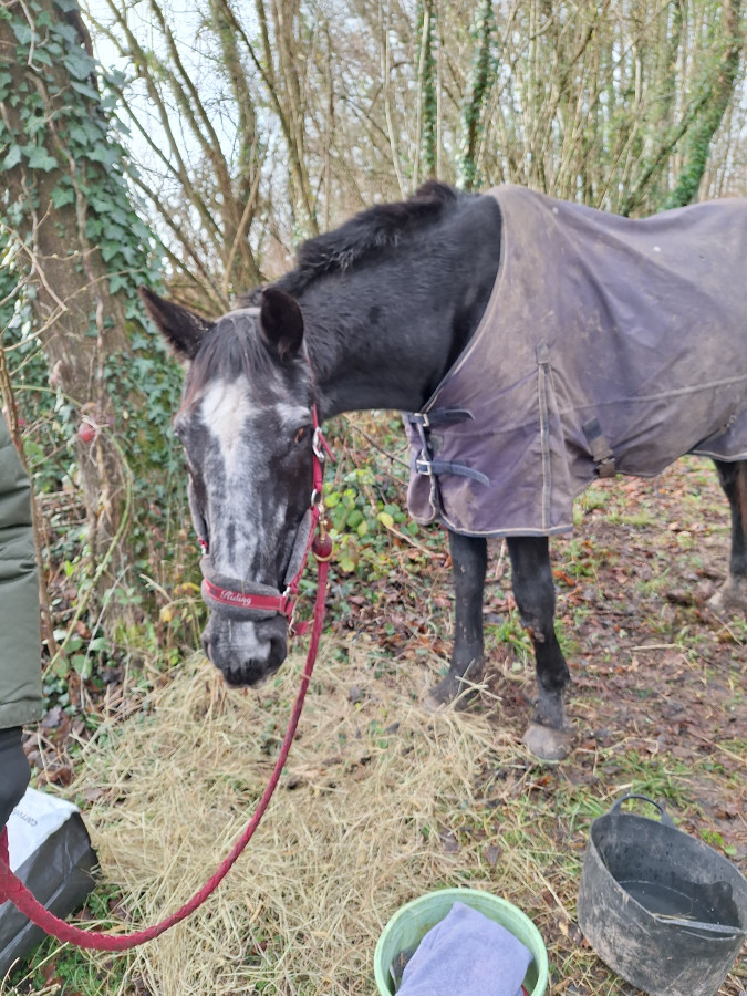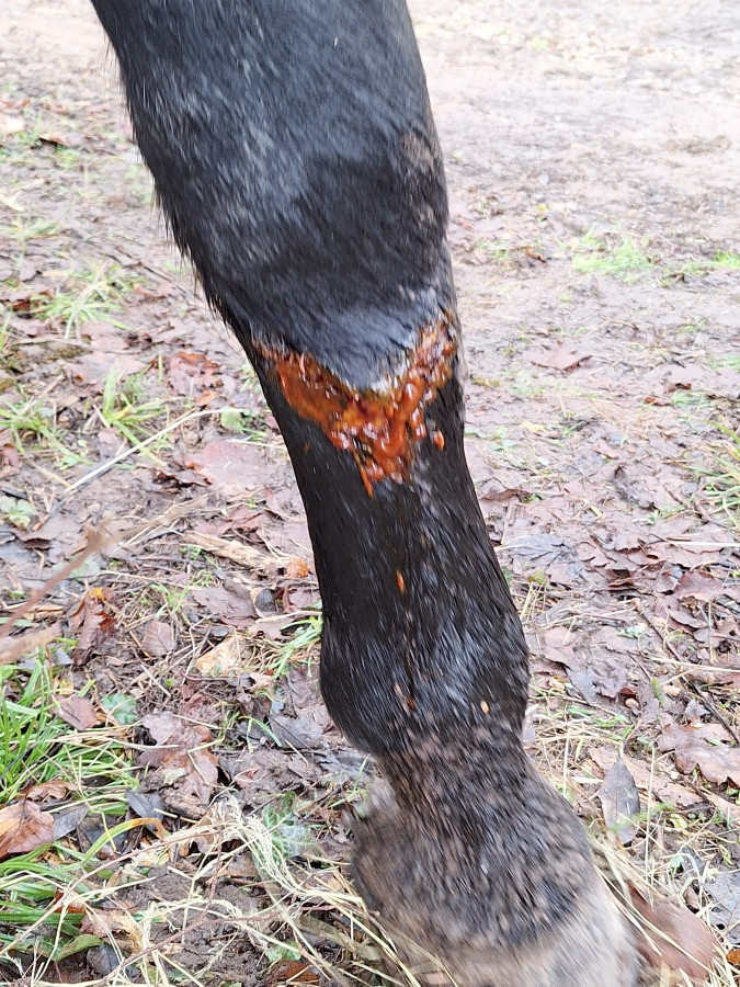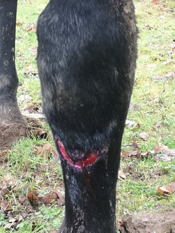 Pour Moon, plus " compliqué" il c'est fait taper et a un beau bobo a un antérieure. Ça fait trois jours que je le soigne, il est engorgé mais aucune boiterie.