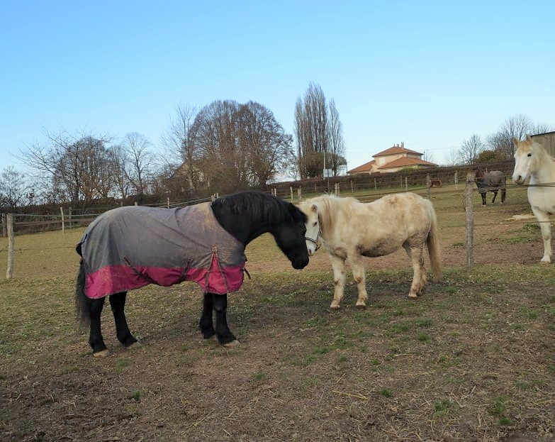 voilà loulou avec son copain de 33 ans... Car , oui , maintenant que loulou est en retraite on essai le pré/abris h24 même l'hiver.