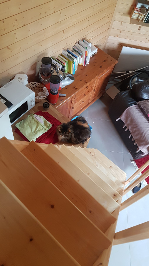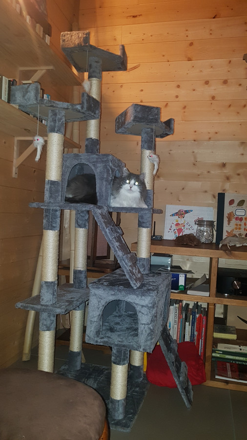 Elle est super marrante, complètement à l'ouest elle passe du coq à l'âne, n'a aucune logique dans ses actions, la voir vivre donne le tournis ! Elle est très, très, très câline et a le ronronnement facile. Une vraie perle : moi qui rêvais depuis toute gamine d'avoir une tricolore à poils longs ... Je suis comblée Elle a fêté ses trois ans depuis peu.