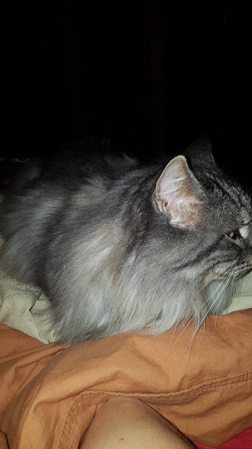 Aku est un chat bizarre : il agit encore comme un chaton à bien des égards, énormément de complaintes, de besoins de câlins, il ne respecte PAS DU TOUT le consentement des autres chats et se prend des baffes tous les jours car ils se jettent sur les autres pour avoir des bisous ... Il est très, très peureux mais ça commence à se calmer, il était temps .... Son point positif ? Il est splendide Il a maintenant quatre ans.