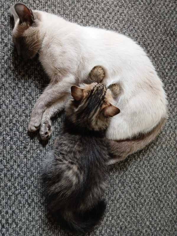 La maman sature de ouf, je rigole quand je lis qu'il faut absolument laisser les petits jusqu'à 3 mois ... depuis leur 1 mois et demi, elle est souvent désagréable avec eux et là, à 9 semaines, elle ne laisse quasi plus têter et les évite au maximum elle se perche en haut des arbres à chat et les dégage s'ils s'approchent.