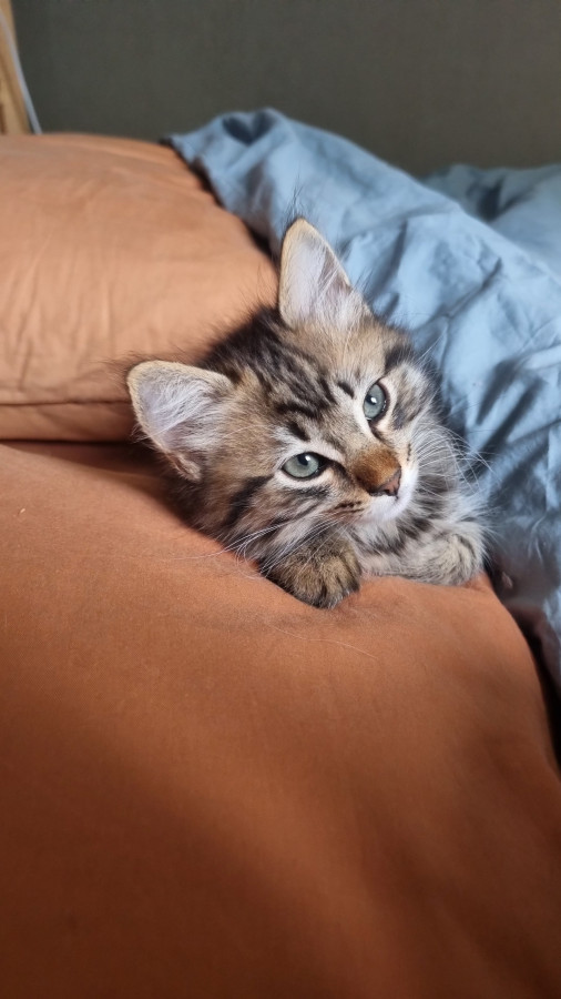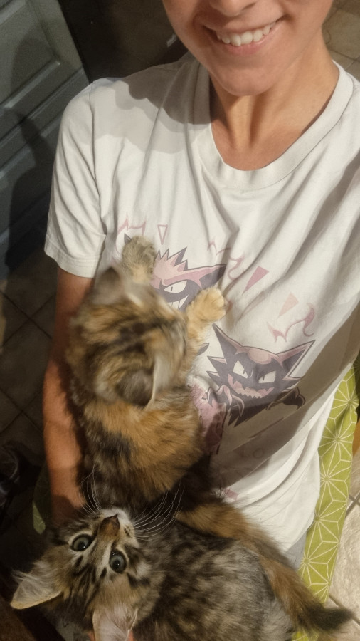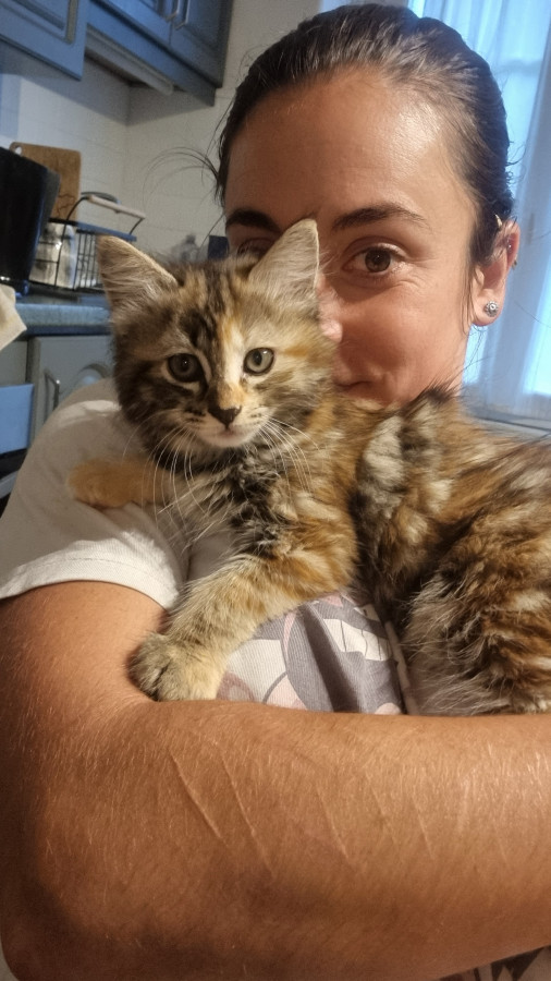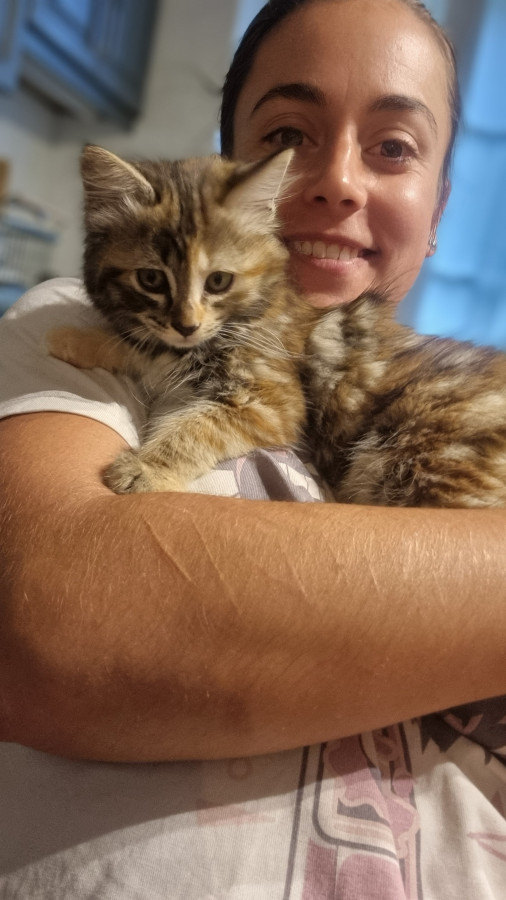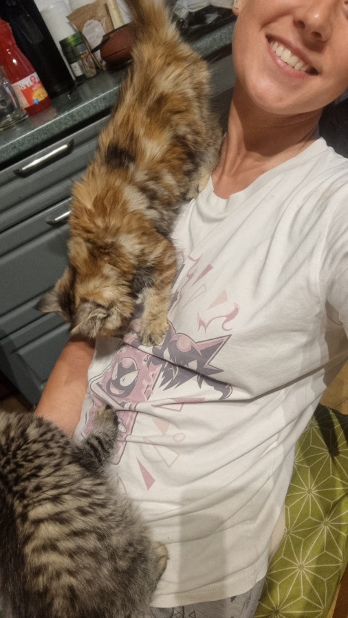 Elle est super marrante, complètement à l'ouest elle passe du coq à l'âne, n'a aucune logique dans ses actions, la voir vivre donne le tournis ! Elle est très, très, très câline et a le ronronnement facile. Une vraie perle : moi qui rêvais depuis toute gamine d'avoir une tricolore à poils longs ... Je suis comblée Elle a fêté ses trois ans depuis peu.