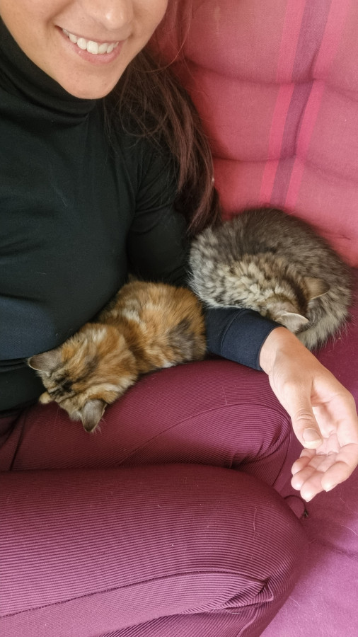 Inaya est arrivée la première, j'avais complètement craqué sur la photo de son annonce à la SPA du 77 et j'ai emménagé au plus tôt dans ma ferme dans l'unique but de ne pas la voir filer sous mon nez ! C'est une chatte peu câline, n'aimant que ponctuellement le contact avec les humains et ses congénères. Solitaire et très indépendante, je l'ai retrouvée en haut de la grange le premier jour de sa sortie elle est curieuse mais on ne peut pas dire qu'elle soit "gentille", elle a le coup de griffe facile.