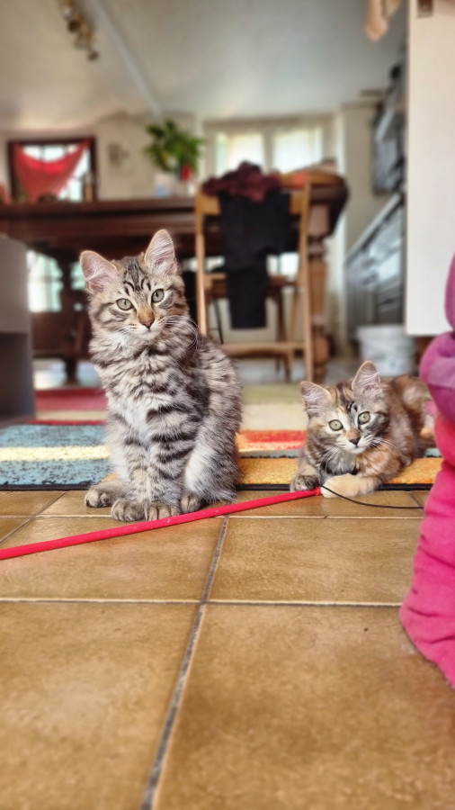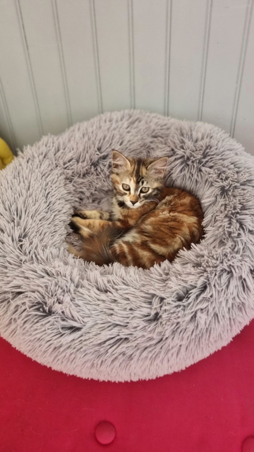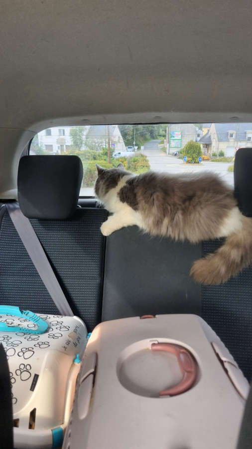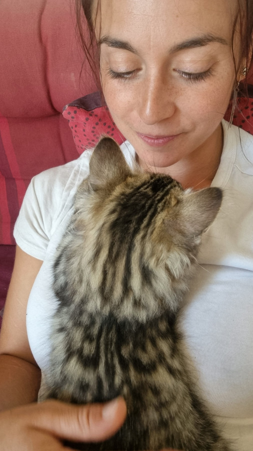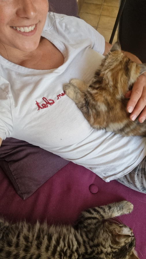 Elle est super marrante, complètement à l'ouest elle passe du coq à l'âne, n'a aucune logique dans ses actions, la voir vivre donne le tournis ! Elle est très, très, très câline et a le ronronnement facile. Une vraie perle : moi qui rêvais depuis toute gamine d'avoir une tricolore à poils longs ... Je suis comblée Elle a fêté ses trois ans depuis peu.