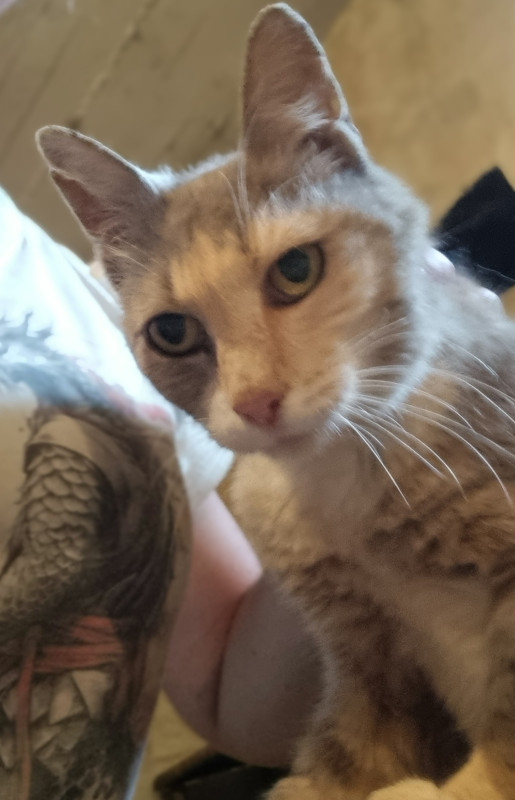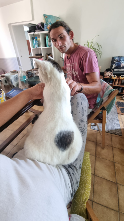 Aku est un chat bizarre : il agit encore comme un chaton à bien des égards, énormément de complaintes, de besoins de câlins, il ne respecte PAS DU TOUT le consentement des autres chats et se prend des baffes tous les jours car ils se jettent sur les autres pour avoir des bisous ... Il est très, très peureux mais ça commence à se calmer, il était temps .... Son point positif ? Il est splendide Il a maintenant quatre ans.