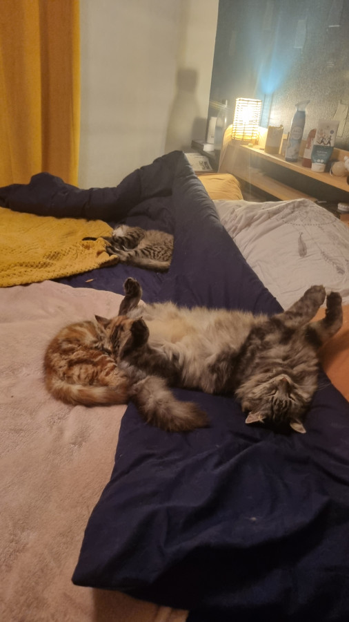 Je me suis dit "mais il y a un problème comment l'un peut être chaton et l'autre déjà faire gros matou adulte ? " avant de voir le bébé au fond. Pas réveillée la fille