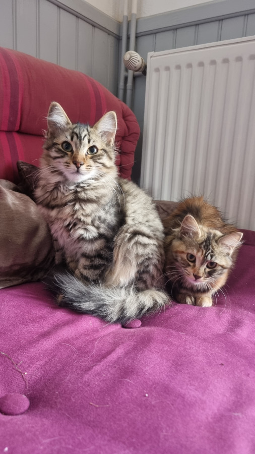 Elle est super marrante, complètement à l'ouest elle passe du coq à l'âne, n'a aucune logique dans ses actions, la voir vivre donne le tournis ! Elle est très, très, très câline et a le ronronnement facile. Une vraie perle : moi qui rêvais depuis toute gamine d'avoir une tricolore à poils longs ... Je suis comblée Elle a fêté ses trois ans depuis peu.