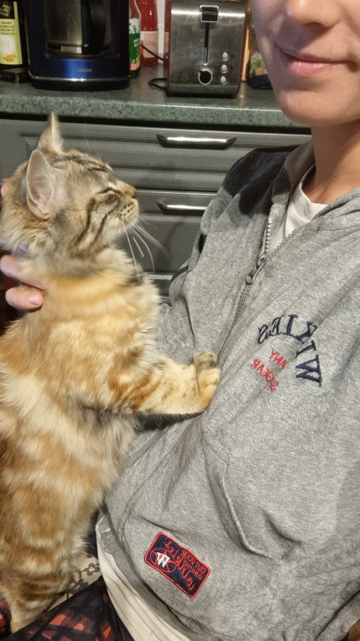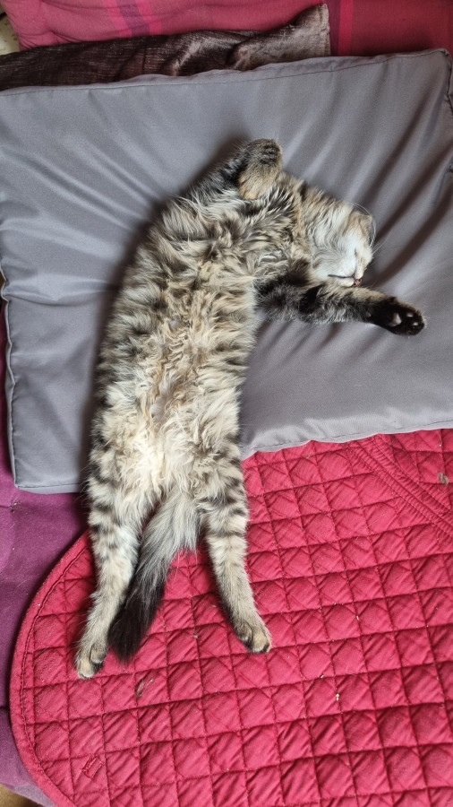Elle est super marrante, complètement à l'ouest elle passe du coq à l'âne, n'a aucune logique dans ses actions, la voir vivre donne le tournis ! Elle est très, très, très câline et a le ronronnement facile. Une vraie perle : moi qui rêvais depuis toute gamine d'avoir une tricolore à poils longs ... Je suis comblée Elle a fêté ses trois ans depuis peu.